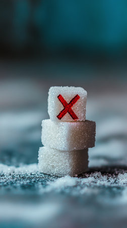 Three sugar cubes stacked with a red cross on top, symbolizing sugar reduction and raising awareness about excessive sugar consumption