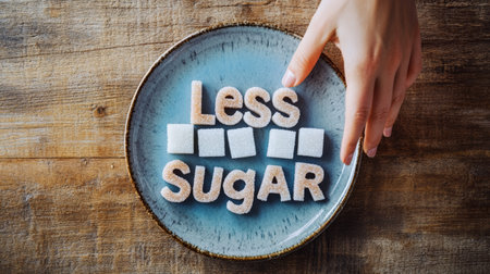 Hand removing sugar cubes from a plate with the words less sugar spelled out in brown sugar granules, promoting healthy eating habits and reduced sugar intake for improved well being