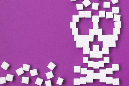 Skull made of sugar surrounded by sugar cubes symbolizing danger of excessive sugar consumption