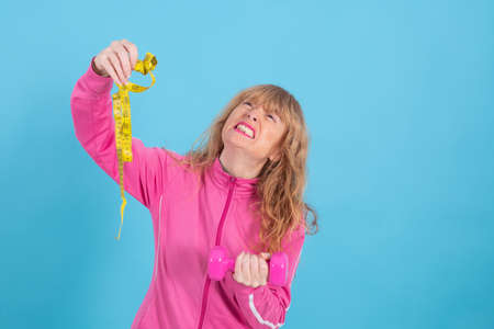 woman with weighing scale and measuring tape with expression of effort and difficulty on colored background