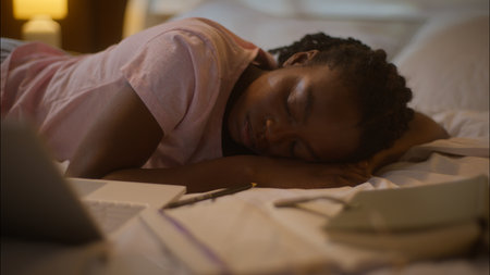 Exhausted Black Freelancer Guy Sleeping On Laptop Lying In Bed At Home. Freelance And Distant Work. Panorama