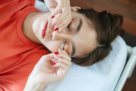 Young happy woman is lying in bed in the morning with her eyes closed and waking up. Concept of healthy sleep, comfort and a pleasant start of a new day. top view.