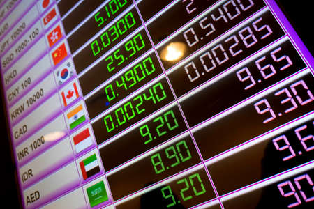 Sales profit numbers changing on monitor after global trade, real time exchange market stocks statistics growing. Financial graphs showing money trend, risk buying. Close up. Tripod shot.