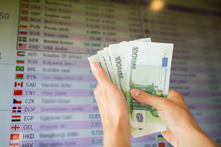Hands holding euro and dollars. EUR in front a monitor with a price chart.Forex and trading.A trader trades stocks,bonds and securities or currencies on the Forex market or stock exchange for euro