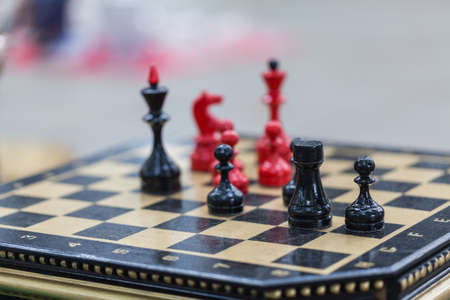 A chess board and black and white chess pieces on a wooden table, close-up, selective focus