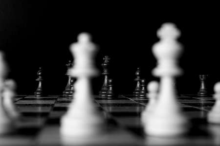 Chess game with board and chess pieces. Selective color focus and B&W chessboard.
