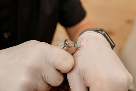 Surgeon uses long drill during the surgery of ulna bone correction closeup