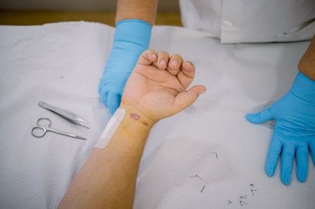 Detail of devastated skin cleaning by medic hands. Professional help in the hospital. Deep scratches on the skin with bruises and wet tracks