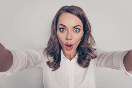 Self portrait of nice, cute, trendy, elegant, charming, positive, shocked woman with curls hairdo wide open eyes mouth shooting selfie on front camera with two arms isolated on grey background