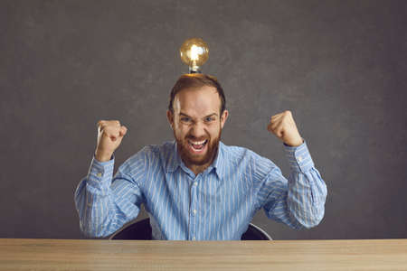 Portrait of funny crazy bearded man with light bulb on head sitting at table clenching fists and shouting Eureka. Creative power of human mind generating powerful ideas that can make business stronger