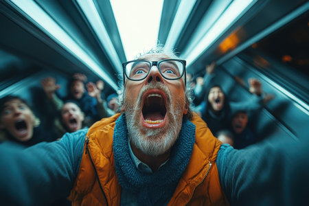 A man with glasses displays a huge smile and wide eyes showcasing excitement and joy in a warm indoor setting conveying a playful mood.
