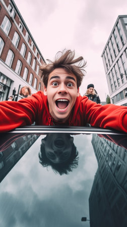 A quirky, close-up fish-eye portrait of a young woman with a wild, wide-eyed expression of excitement or surprise, with her hair blowing in the wind. The motion-blurred background adds to the dynamic and energetic feel of the image.