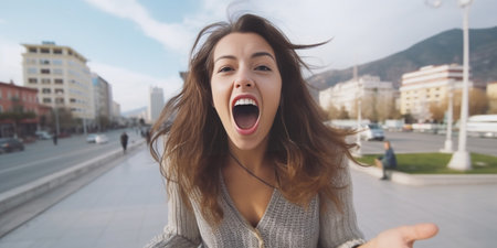 Young positive woman takes selfie while strolling in city and listening music in headphones has happy expression enjoys day off stands against blurred background People l : Generative AI