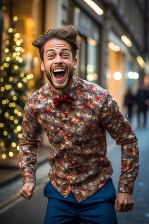 Happy cool bearded darkskinned guy in black pants and floral stylish shirt dances smiles and poses outside : Generative AI