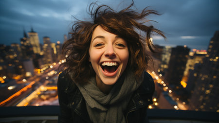 Adventurous man captures daring rooftop selfie in the bustling citys summertime panorama. Concept Rooftop Selfie, Cityscape Views, Summertime Adventure, Urban Exploration, Daring Photoshoot