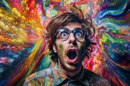 Young man with glasses showing surprised face on a vivid background, expressing emotion, fun, and playful shock.