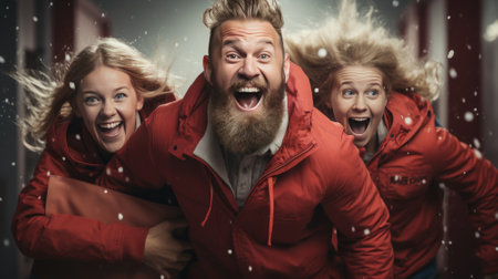 Four individuals display excitement and happiness in a colorful setting, showcasing a range of joyful expressions and poses.