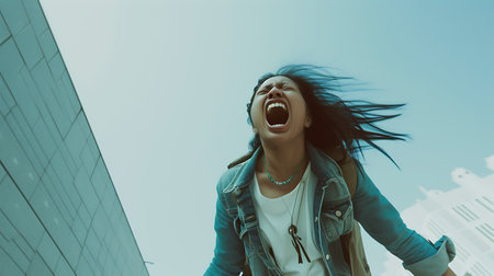 Photo of funky excited lady dressed jeans and shirt, empty space isolated background. with Generative AI