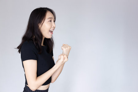 a Japanese woman showing joy on a studio background