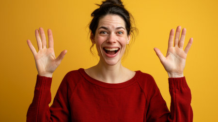 a woman with her hands up on a yellow background