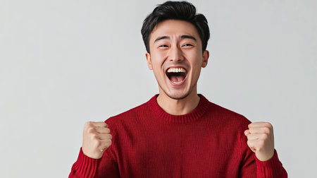 A proud Asian man with a triumphant smile, winning a competition.