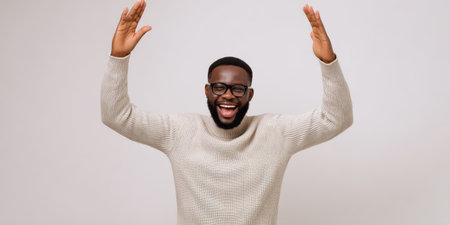 Happy black man in glasses and a light sweater raising his arms in a gesture of success and excitement, expressing joy and achievement on a white background