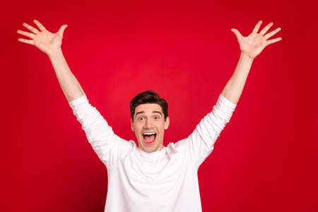 winner in life. happily excited handsome man with nice smile in yellow shirt with both arms raised up on grey background.