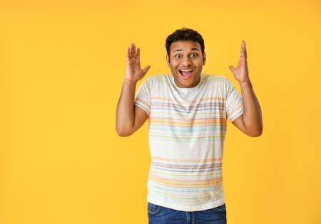 Excited man on color background