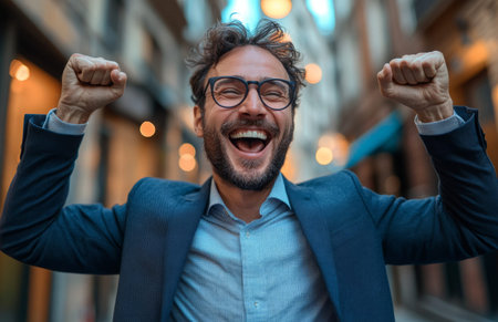 Joyful man celebrating with raised arms