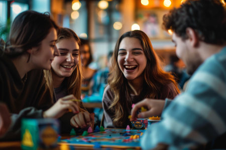 A group of children sitting around a board game, laughing and concentrating as they play, A family game night filled with laughter and competition