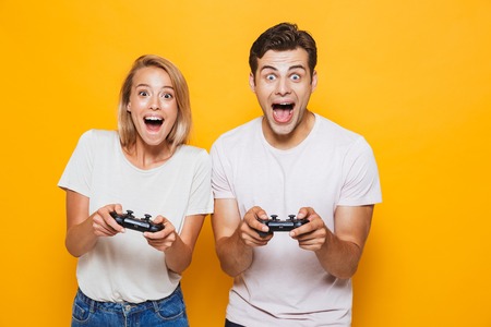 Photo of happy excited young loving couple standing isolated over yellow wall background play games with joysticks.