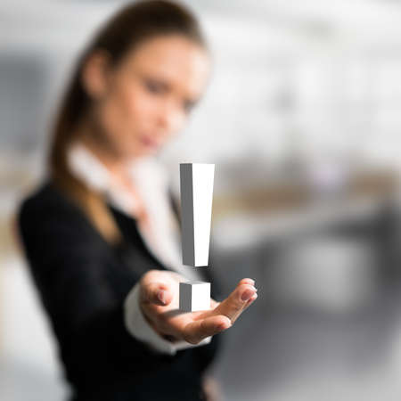 young business woman, holds. exclamation mark