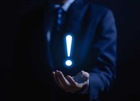 businessman hand showing exclamation point business development ideas Warning of errors, dangers, alerts, maintenance, And finding solutions. Important information. Dark background with copy space.