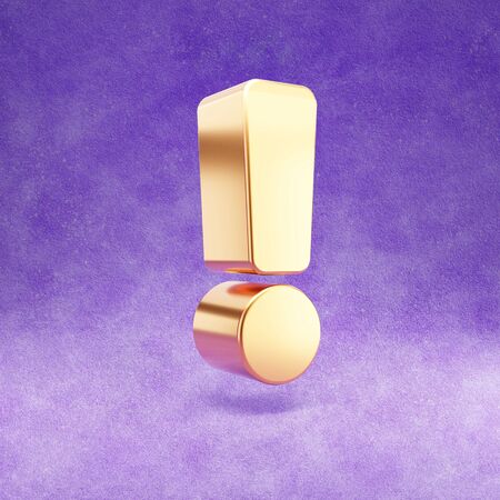 Exclamation icon. Gold glossy Exclamation point symbol isolated on violet velvet background.
