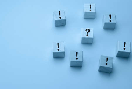 wooden cubes with exclamation marks and a question mark in the middle on a light blue background. Question and answer concept, search for truth