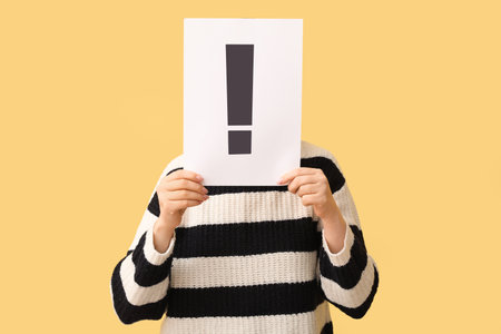 Woman covering her face with paper exclamation mark against color background