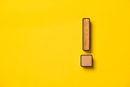 Exclamation mark symbol. Exclamation mark on wooden cubes. Beautiful yellow background. Business and Exclamation mark concept. Copy space.