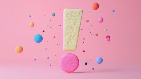 Colorful fuzzy exclamation mark on pink background, playful design concept