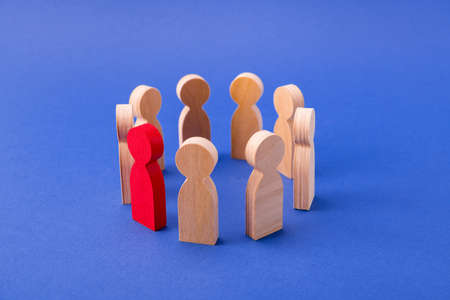 Wooden figures of people gathering standing in circle talking to one special guy talented businessman company owner isolated over bright vivid shine vibrant blue color background
