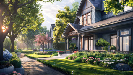Neighborhood architecture. Property in neighborhood. Residential property house. Residence architecture. Suburban neighborhood. Suburban house architecture. Private family house. Housing market