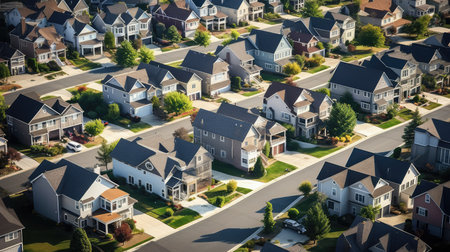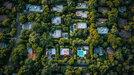 An overhead view reveals a suburban neighborhood comprised of houses and trees. The scene displays a variety of colors, featuring warm tones and varying textures. The composition creates a sense of depth, suggesting an outdoor environment during the day, suitable for various editorial and commercial applications.