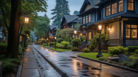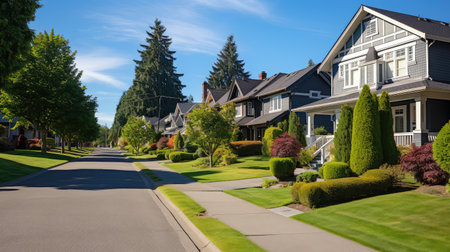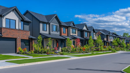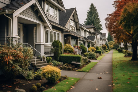 quiet residential street, with houses lined up in perfect symmetry, created with generative ai