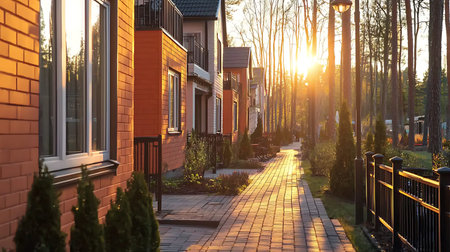 A picturesque view of a walkway lined with modern homes during a beautiful sunset amidst lush greenery. Ideal for conveying serenity and community.