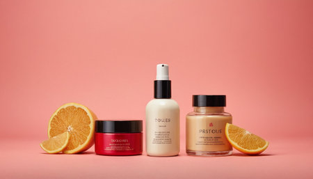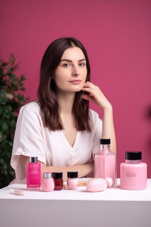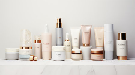 A variety of cosmetics and skin care products are displayed on a table, AI