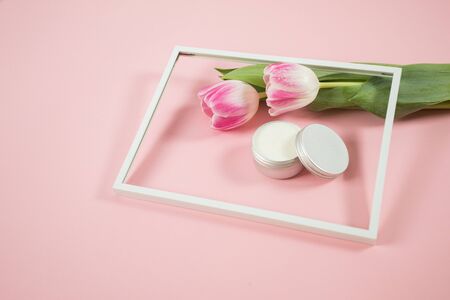 Spa accesories on the pink background with some tulips and facial cream