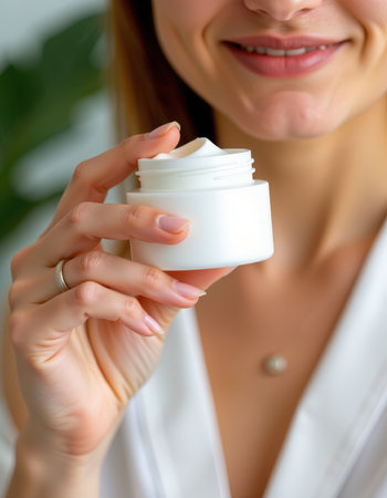 Close-up of a woman holding a jar of moisturizing cream