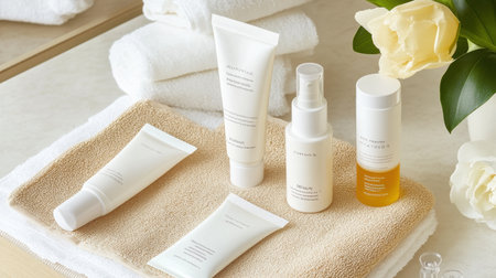 A serene and elegant display of skincare products arranged on a soft towel with fresh roses, perfectly capturing a calming beauty routine and self-care experience.