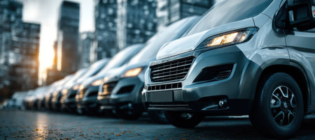 Gray commercial vans are lined up in an urban environment, highlighting their sleek design and practicality, with a vibrant city skyline illuminated by sunset