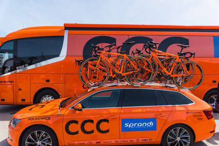 Alghero, Italy - May 05, 2017: CCC Sprandi Polkowice team bikes on the opening day of Giro d'Italia
