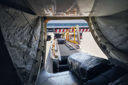 Loading of luggage to airplane. Suitcases on conveyor belt to plane.
